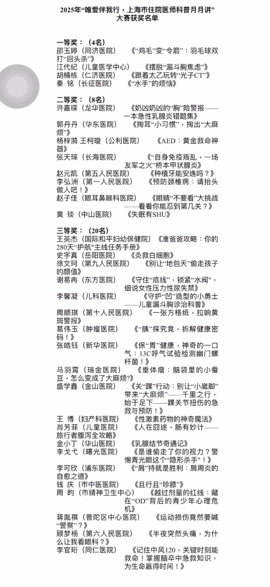 进程严格聘请与决赛比拼,同济大学附属同济病院邵玉婷、舟师军医大学第二附属病院秦铭、上海交通大学医学院附属上海儿童医学中心江代纪、上海交通大学医学院附属仁济病院胡楠栋四位医生脱颖而出,荣获一等奖。受奖典礼现场,四位一等奖获取者划分带来《“鸡毛”变“令箭”:羽毛球双打“回头杀”》《“水手”的烦闷》《解脱“漏斗胸惊悸”》《随着太乙玩转“光子CT”》等主题展示,以灵活理由的抒发、塌实严谨的本质赢得全场强烈掌声。