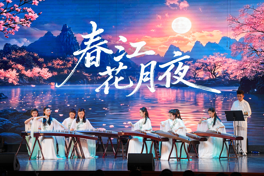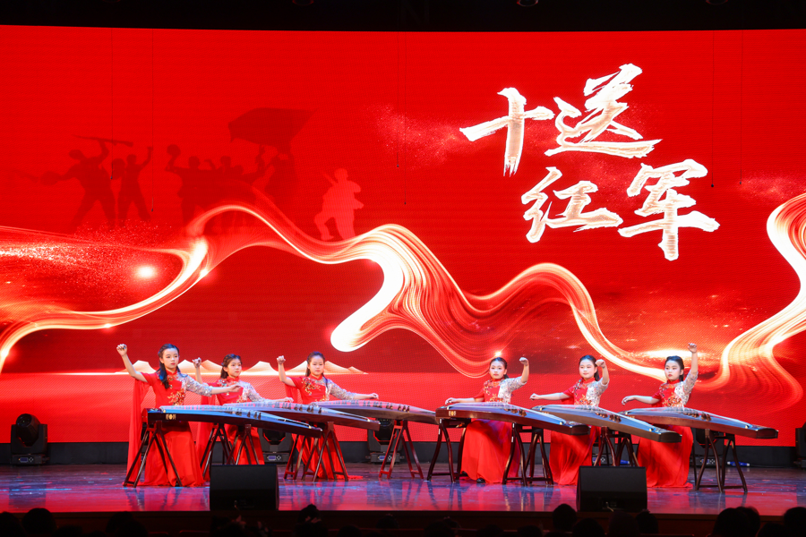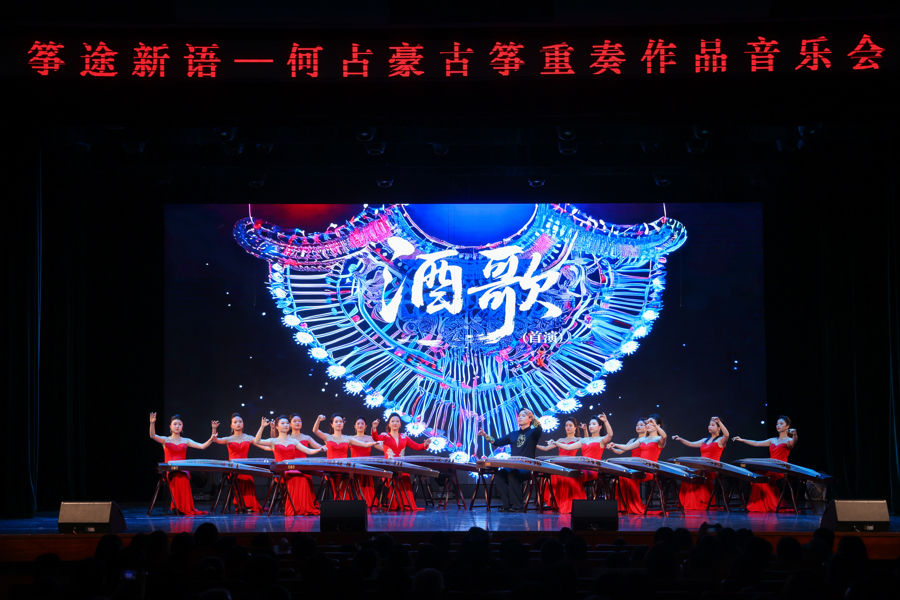 灯光渐亮,数十架古筝王人鸣,《不忘初心》的旋律迟缓流淌。当晚表演曲目匠心独运,尽显家国情感。红色经典系列里,《打靶追溯》《映山红》《我和我的故国》经古筝重奏改编,档次丰富、韵味悠长。 民族风情篇章中,《苹果熟了》与《水红花令》《太阳还在半坡房》等2025年新作同台亮相,交融南北地域特色、会聚多民族音乐精华。
