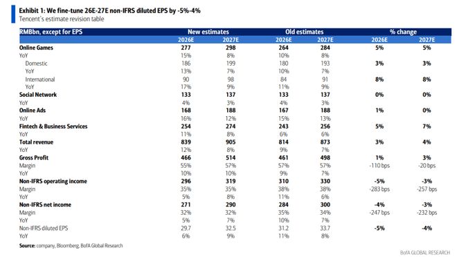为了反馈AI投资的增多,好意思银好意思林将腾讯2026年和2027年的非IFRS净利润预期永别下调了4%和3%。