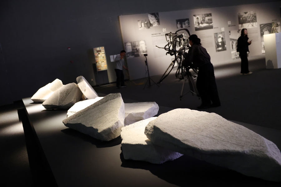 中国好意思术学院训练、纤维艺术家施慧以《“书非书”系列作品:千里想》参展。不限定的白色石块交错横亘在展厅中,其造型源自《读碑窠石图》中碑的形象。“读碑”是中国传统文化史的经典主题,通过读碑传达士东说念主对历史的深千里想考。