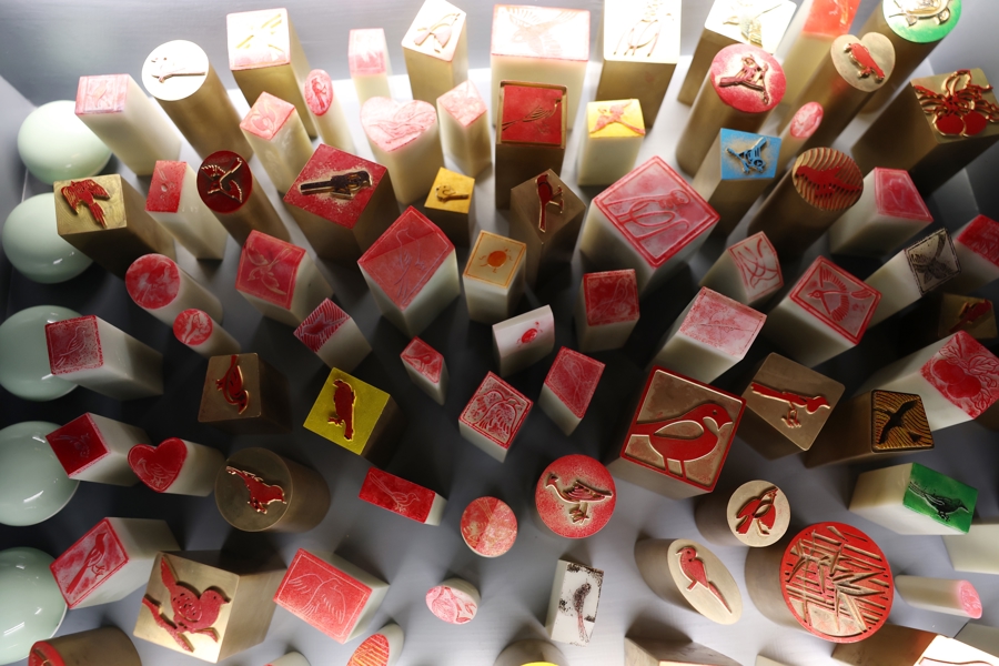 艺术家汪正虹创作了互动名堂《百鸟图迹》,以五代画家黄荃(约903—965)《写生珍禽图》中的禽鸟形象为原型,将其滚动为可捎带的金属胸针,行为通顺不雅众的序论。“‘集’字的甲骨文写法,描画了三只鸟栖居于一棵树上,集即是鸟的汇集。”王小松说,“在威尼斯双年展现场,咱们发了近一万个选取鸟纹胸针,来一个不雅众,咱们就送一个,还把鸟作念成了各式各样的钤记。”
