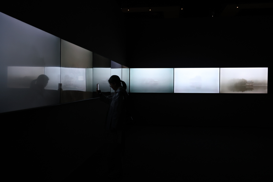 艺术家车建全带来影像安装《亭》,10块连气儿屏幕并置,呈现他自2003年起握续20年对团结座亭子的跟踪拍摄。艺术家通过镜头捕捉亭子在涔涔中时隐时现的模式,令东说念摆布意象中国山水画中“计白当黑”的雾气好意思学。
