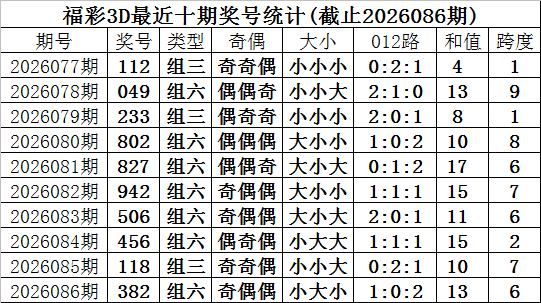 开奖转头:福彩3D第2026086期奖号为382,奖号时势为:组六、小大小、1:0:2、奇偶偶。