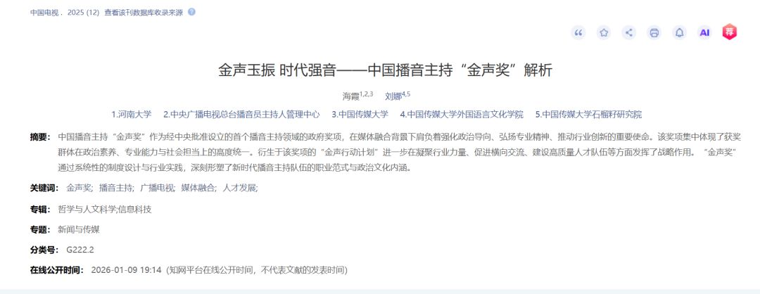 此前,2024年,《电视研究》12月刊收录了海霞为第一作者发表的《深度 温度 态度 力度——优秀播音员主持人及其代表作品解析》。该文也是海霞和刘娜共同署名发表。
