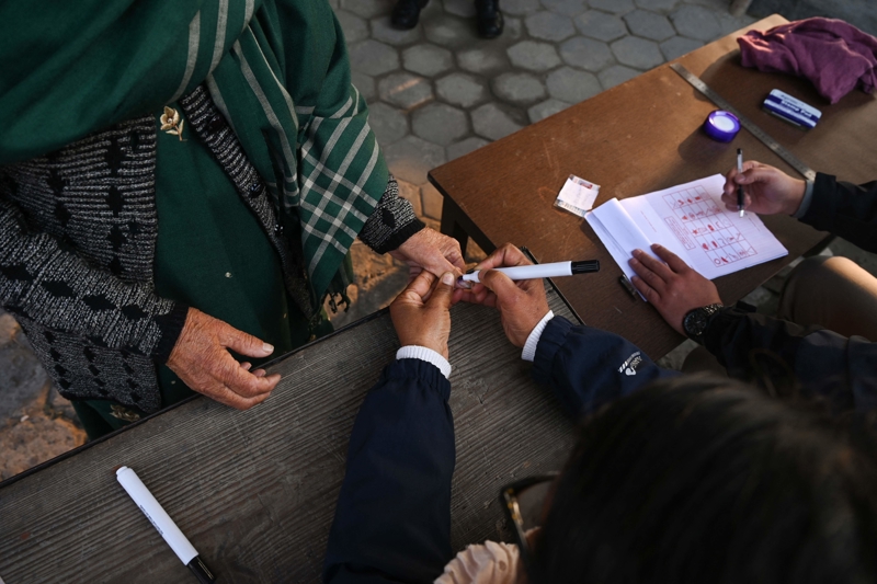 在尼泊尔都门加德满都的一处投票站,使命主说念主员在别称完成投票的女子手上作念标志。\n 新华社/法新