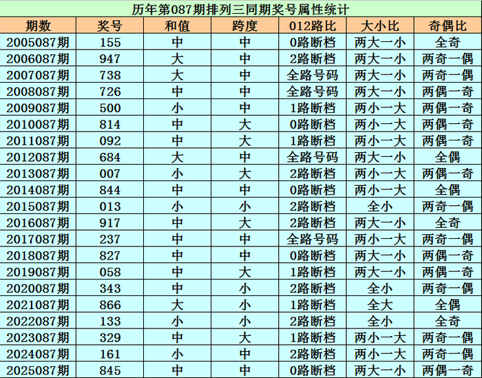 历史上第2026087期陈设三已开出21期奖号了,积年同时奖号别离为:155、947、738、726、500、814、092、684、007、844、013、917、237、827、058、343、866、133、329、161、845,翔实统计见下表: