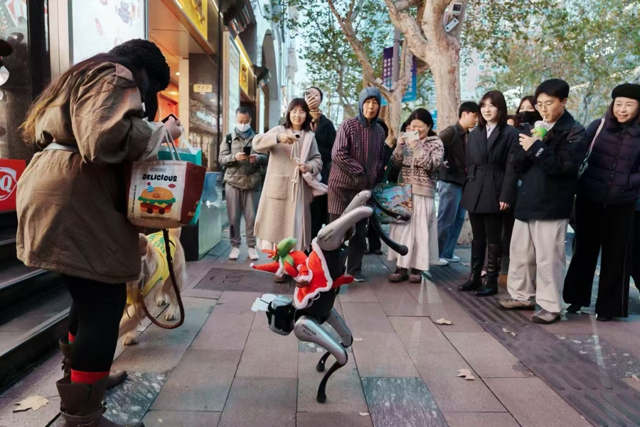魔法原子四足机器狗MagicDog在店前迎宾,展示倒立手段,诱导市民搭客不雅看。受访者供图